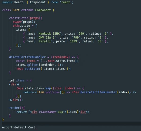 Here we see a shopping cart component that renders items and handles removal of items from the application state.However, if we look more closely at the deleteCartItemHandler This is because it can easily lead to unpredictable applications, which is considered a bad practice.