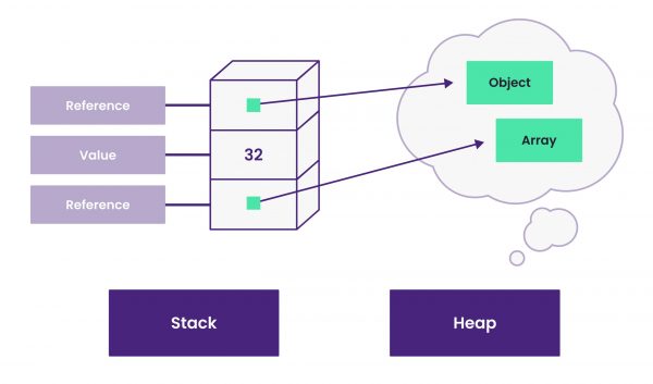 Stack is basically an easily accessible data structure, which simply manages its objects as a heap. Only objects whose size is known from the beginning can be used in this heap, this applies to Number, Stringand Boolean.